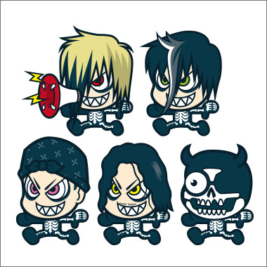 BALZACのメンバーをキャラクター化したイラストです。キーホルダー、Tシャツ等、各種グッズに使用していただきました。 後に、このフォーマットを使って、THE SLUT BANKSやMERRYも描かせていただきました。