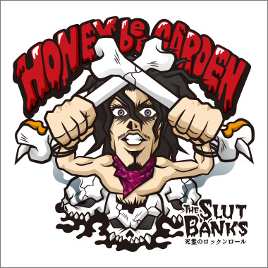 THE SLUT BANKSのドラムHONEYさんのイラストです。ステッカー等に使用していただきました。 HONEYさんの野生感を出すためにドラムスティックを骨にして下半身には髑髏ふんだんにを使いました。 その他詳細はこちらもご覧ください。