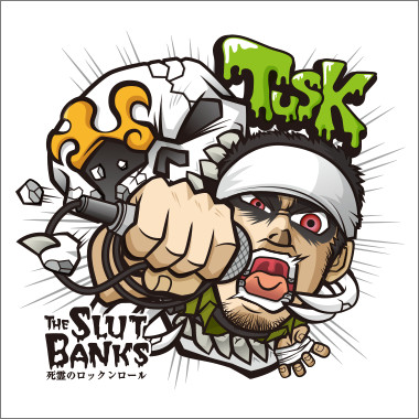 THE SLUT BANKSのボーカルTUSKさんのイラストです。ステッカー等に使用していただきました。 TUSKさん特有の荒々しさを出すためにアングルを工夫し、後ろにある髑髏を砕くなどして迫力を出しました。 その他詳細はこちらもご覧ください。