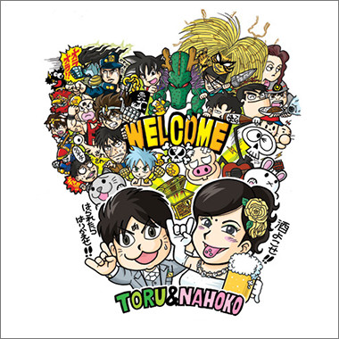 自分の結婚式(の2次会)用のイラストです。ウェルカムボードやパンフレットの表紙に使用しました。お互いが好きなキャラクターを背景に並べまくって趣味全開のデザインになっています。